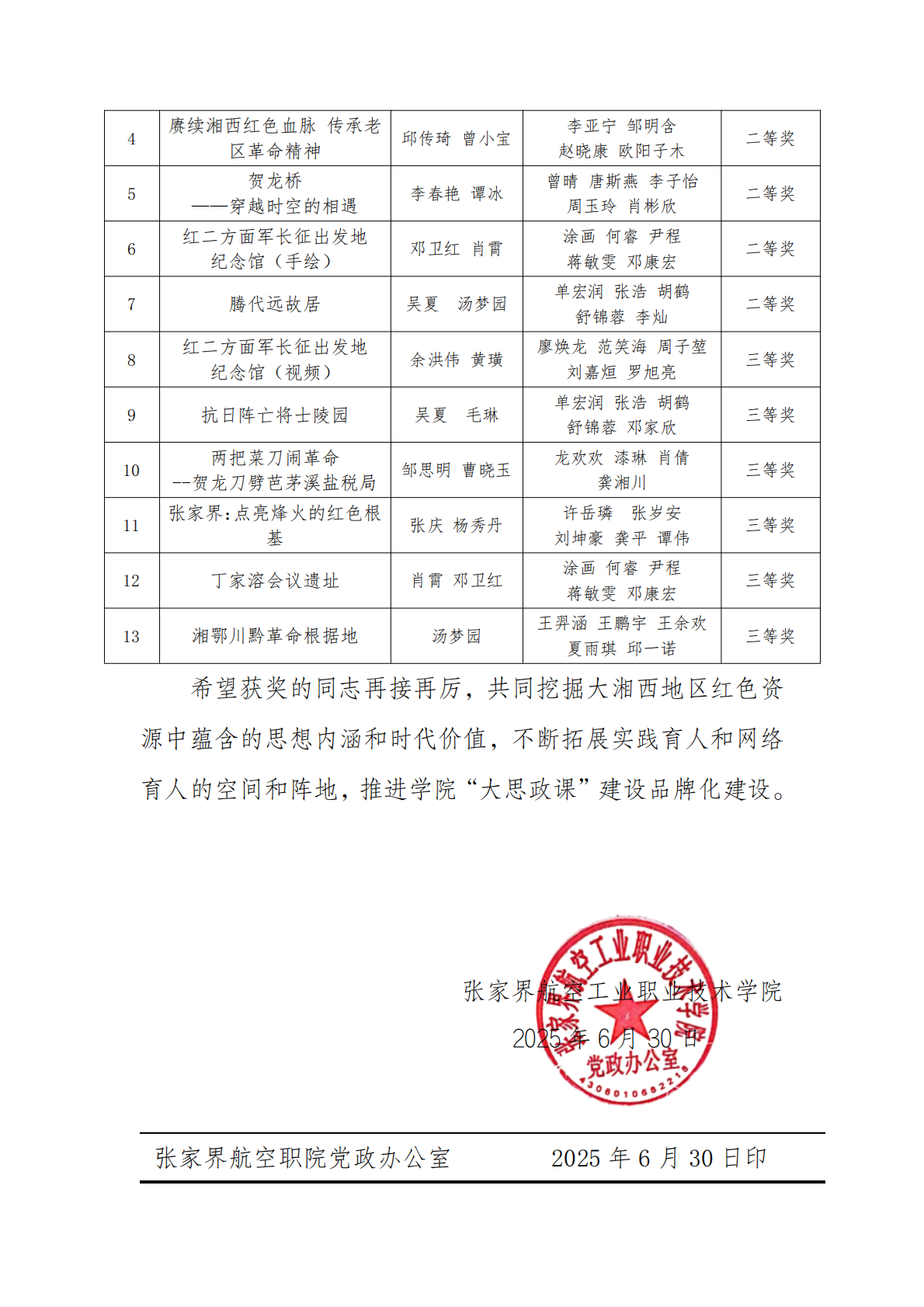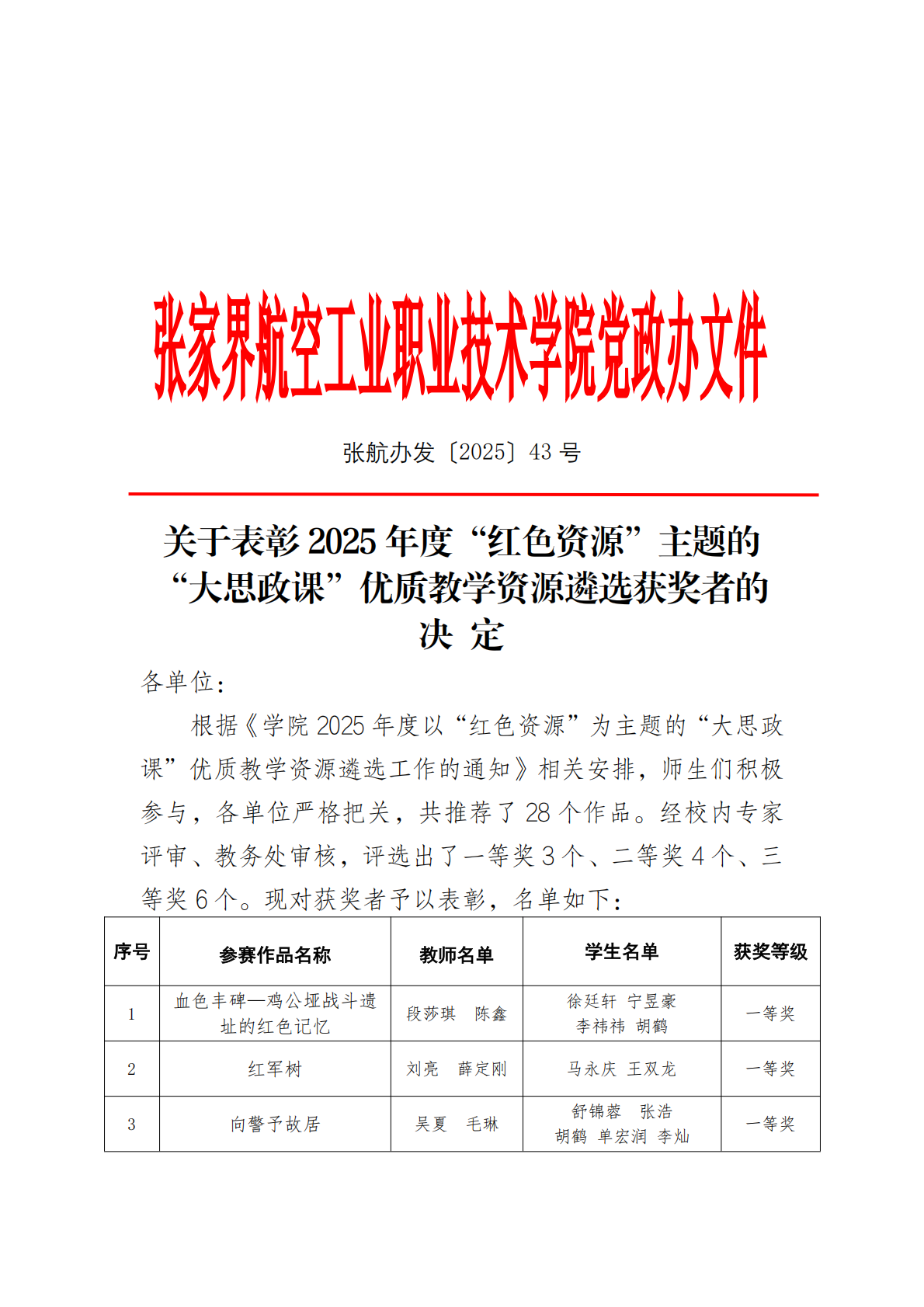 关于表彰 2025 年度“红色资源”主题的 “大思政课”优质教学资源遴选获奖者的 决 定